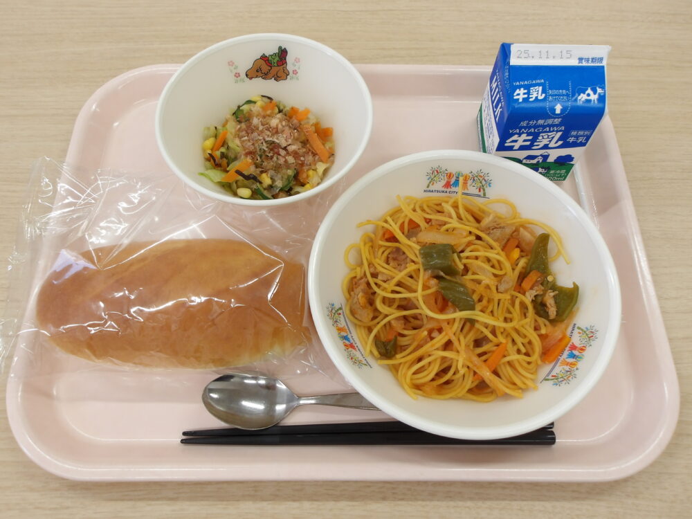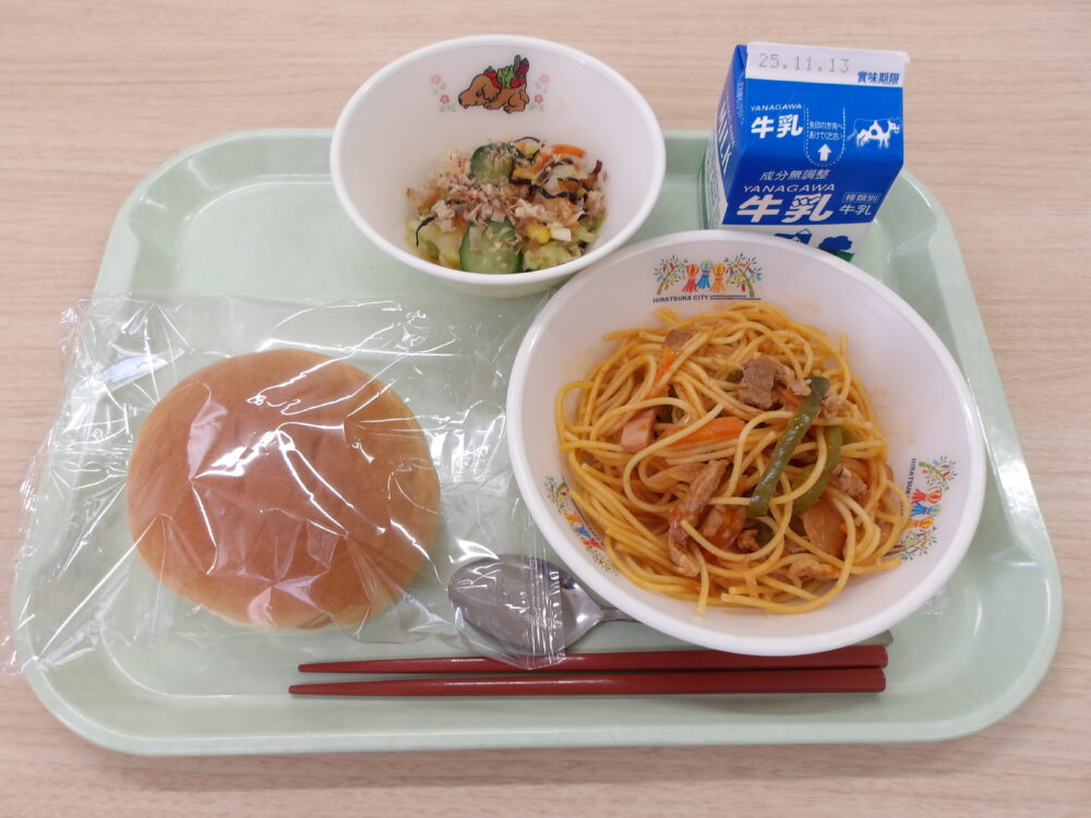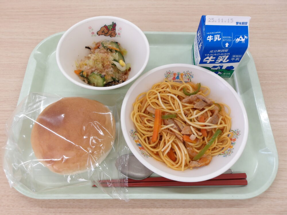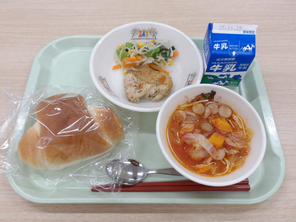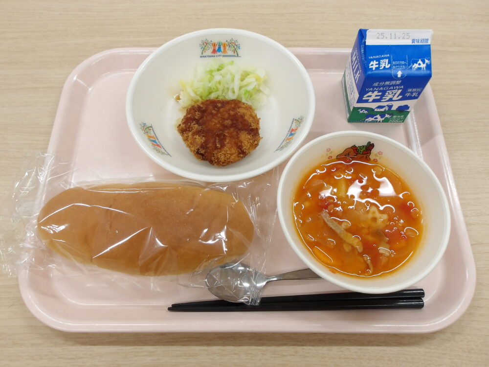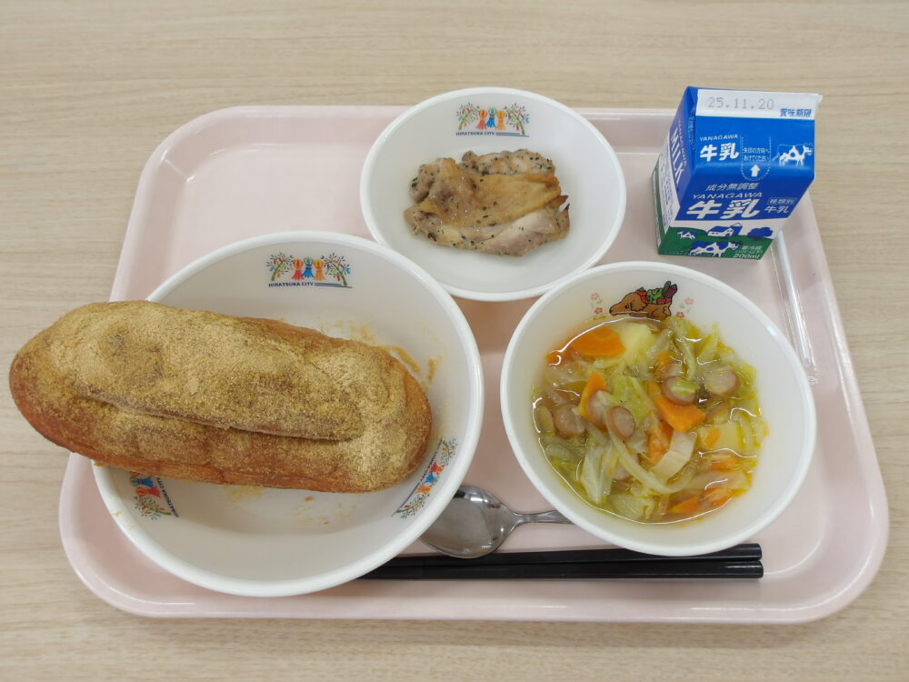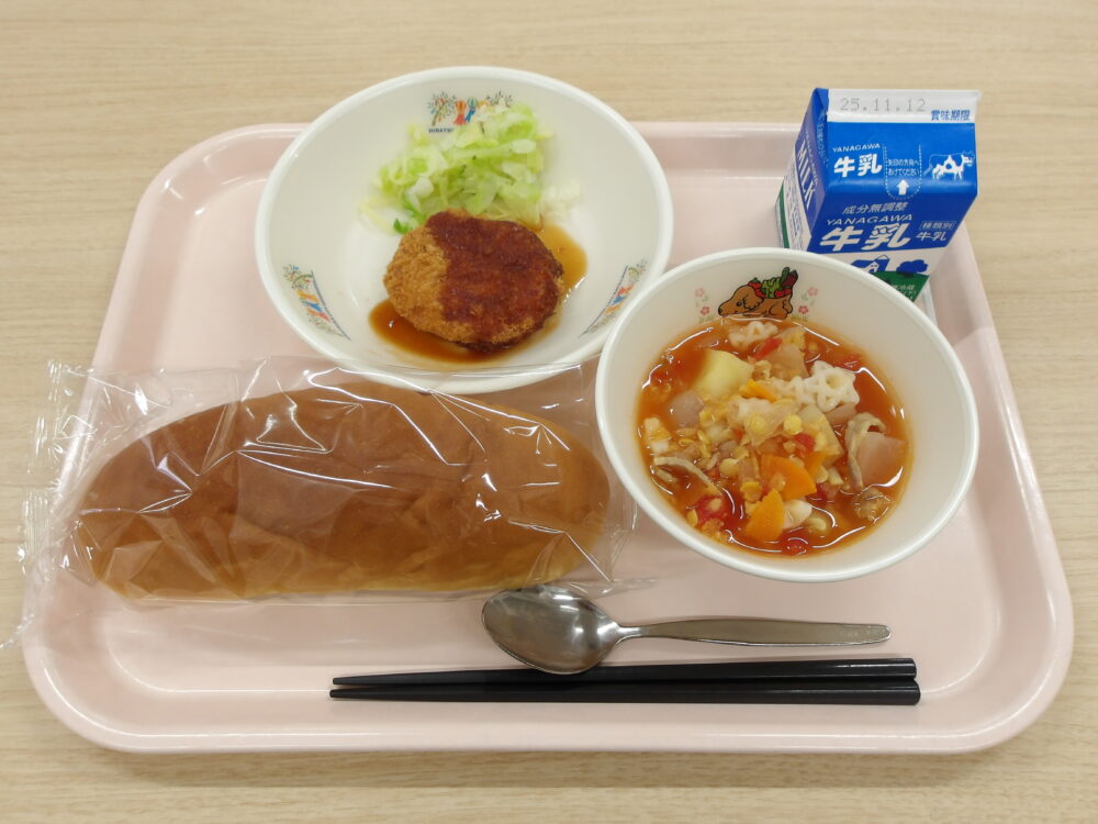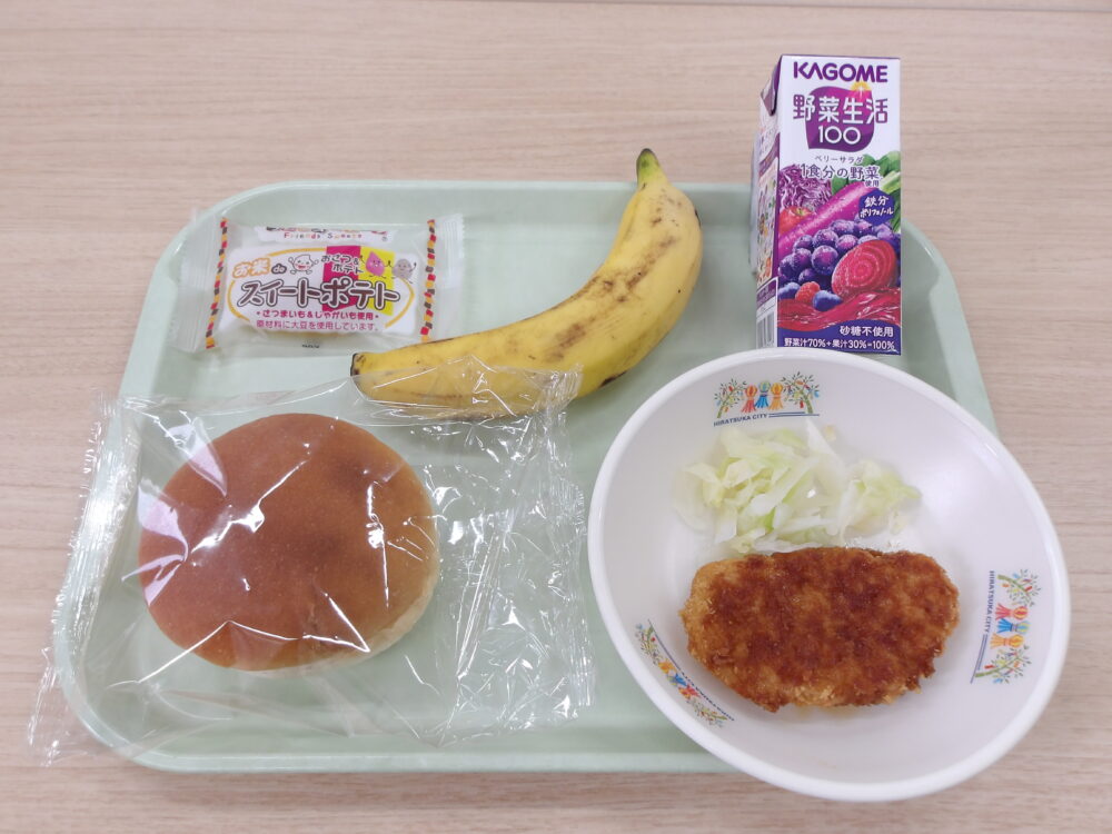 ★なかよし給食★学校によっては、パンにチキンカツとキャベツをはさんで、ビニール袋に入れ持ち運んで食べます