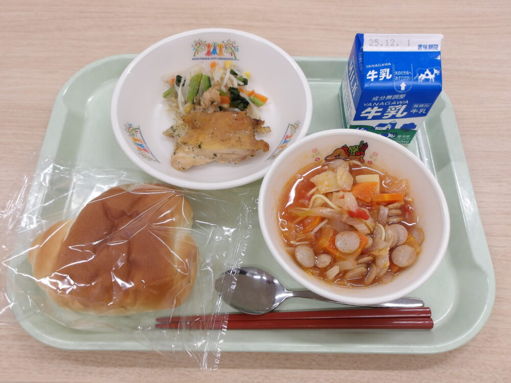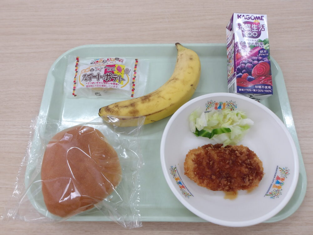 ★なかよし給食★学校によっては、パンにチキンカツとキャベツをはさんで、ビニール袋に入れ持ち運んで食べます